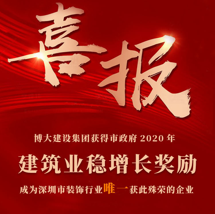 博大建設(shè)集團榮獲深圳市政府2020年建筑業(yè)穩(wěn)增長獎勵,博大是獲此殊榮的唯一一家裝飾企業(yè),當之無愧成為深圳市的行業(yè)龍頭,為行業(yè)爭光。