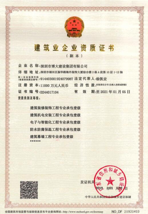 博大建設集團是行業最具發展活力的領軍企業,各項事業突飛猛進,不斷得到社會各界的關注和認可。集團資質建設又有新突破,順利獲得防水防腐保溫工程專業承包壹級資質。